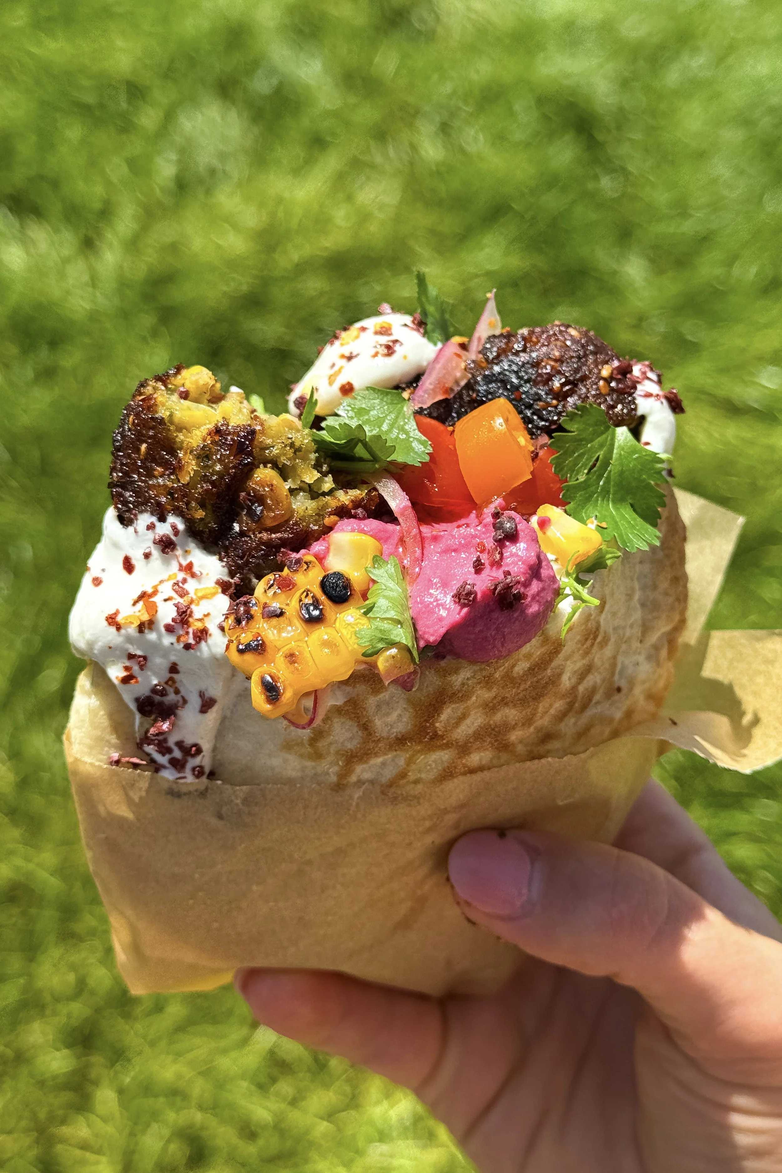 Sweetcorn Falafels: Reserve ½ cup of the corn kernels and set aside. Add the remaining corn to a food processor along with the coriander, onion, garlic, ginger, sesame seeds, salt, spices and baking powder. Blend together for about 1 minute, scraping down the sides of the processor when needed, until the mixture forms a wet, coarse paste (it will be quite wet, you want the starchy liquid to release from the corn kernels). Add the chickpea flour, plain flour and the reserved ½ cup corn kernels. Pulse 2-3 times, or until the flour is just incorporated. Transfer the mixture to a large bowl and fold through the panko breadcrumbs. Set aside for 10 minutes, to allow the breadcrumbs to soak. Then roll heaped tablespoons of the mixture into balls and set aside on a plate - don’t worry if they are a little misshapen, you can roll them again before you drop them into the oil.