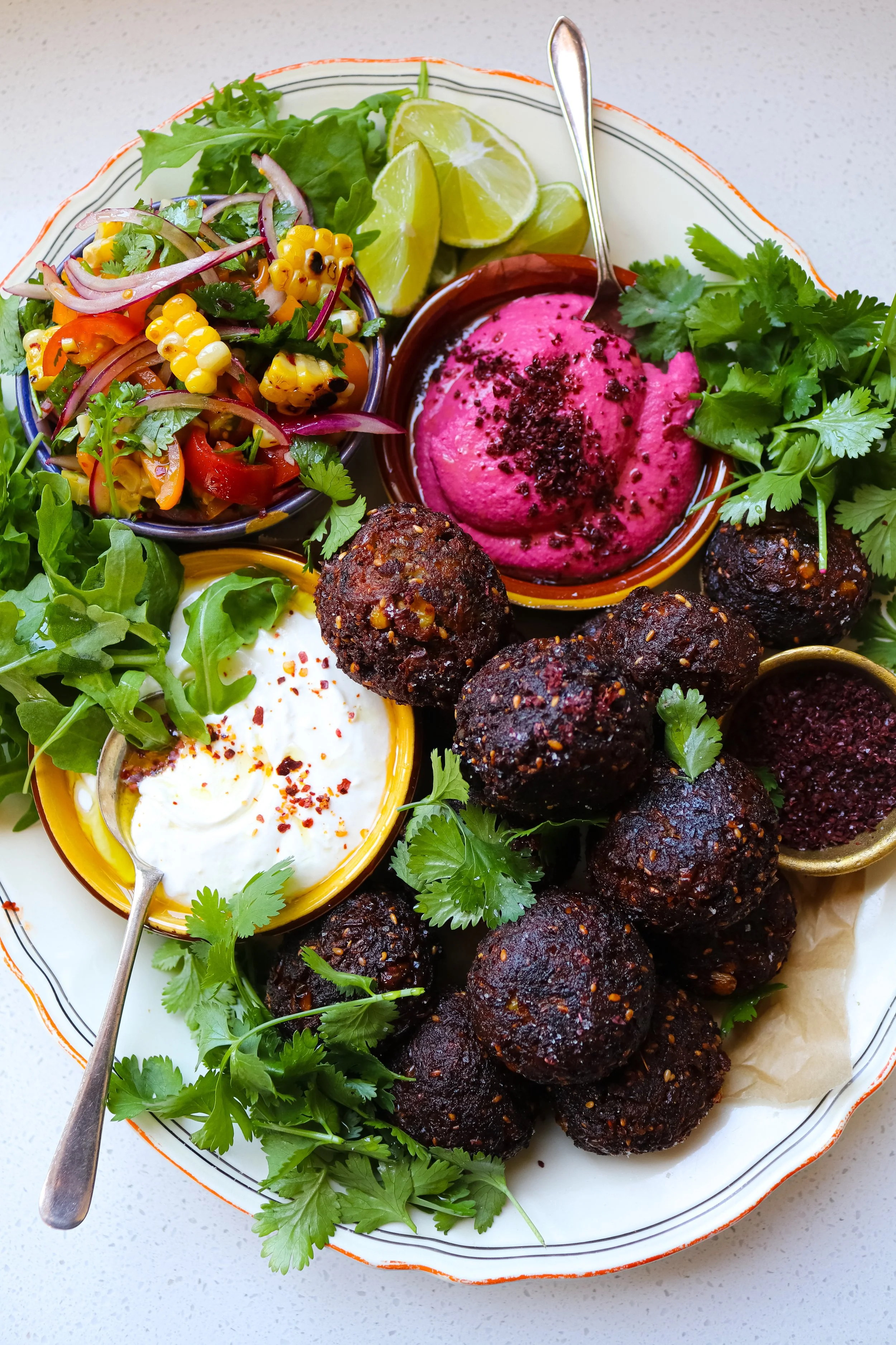 To Serve: Serve the falafels, garlic yoghurt, tomato corn salad, beetroot hummus and rocket on a platter for everyone to build their own pitas.