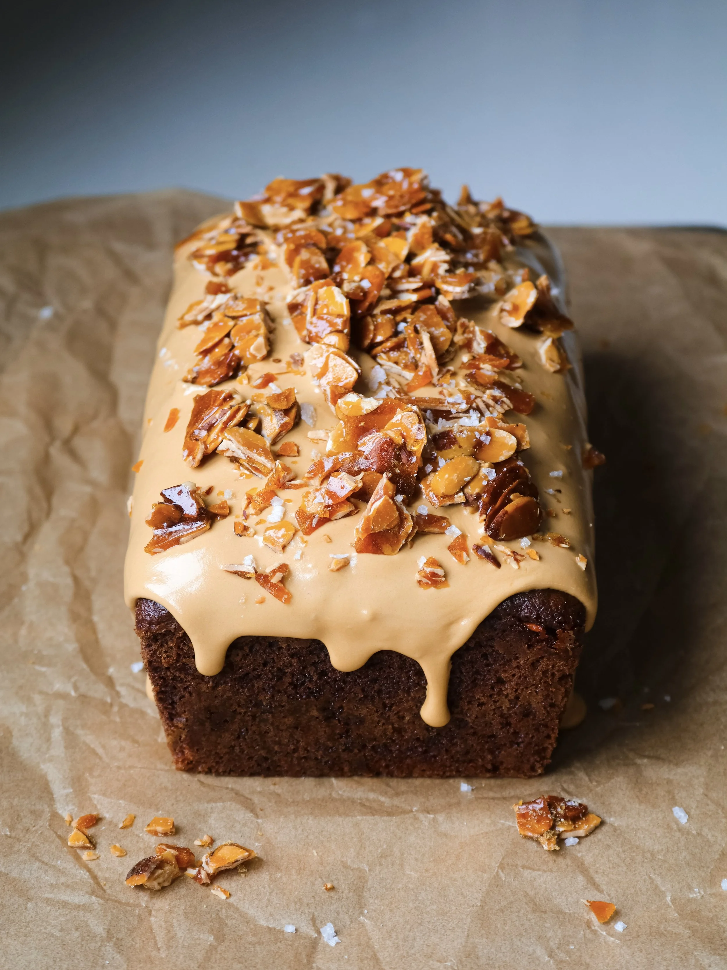 Coffee Icing: Add the icing sugar to a small mixing bowl. Add the espresso, starting with 2 tablespoons, along with the salt. Whisk together until smooth and creamy, adding more espresso as needed to achieve a very thick but pourable consistency. Pour the icing on top of the cooled loaf and spread out over the top. Sprinkle over the remaining almond praline and a pinch of flaky sea salt, if desired. Store the loaf in an airtight container at room temperature for up to 4 days.