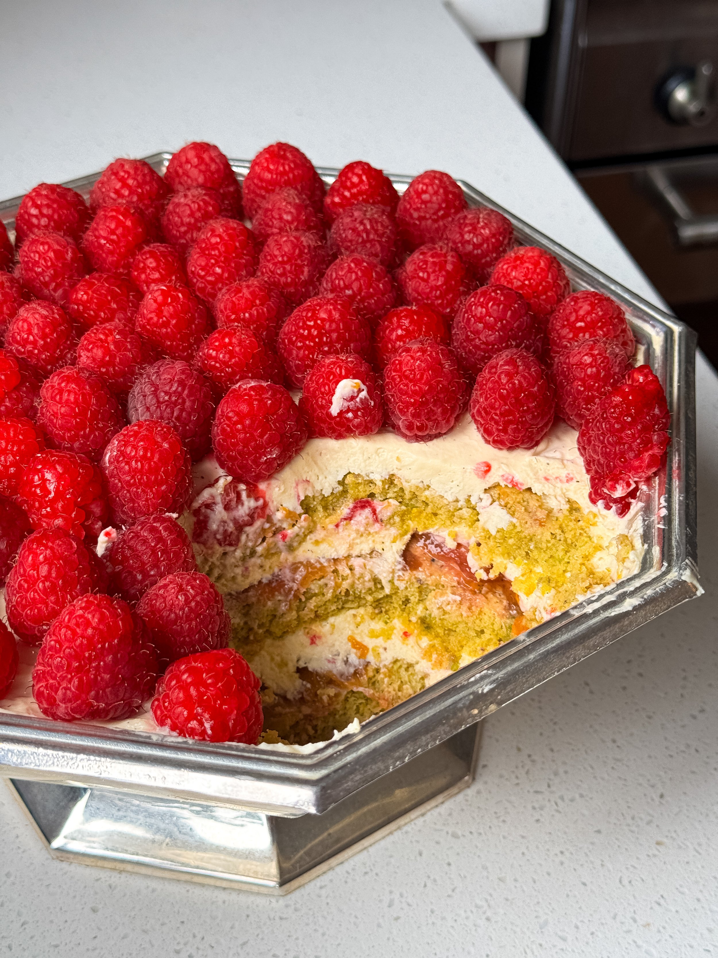 Pistachio Sponge: Separate the eggs and transfer the egg yolks to the bowl of a stand mixer fitted with the whisk attachment. Add ⅓ cup of the caster sugar, vanilla and ¼ tsp salt. Beat on high speed for about 4 minutes, or until the mixture is pale, thickened and fluffy. Transfer the mixture to a large mixing bowl. Sieve the ground pistachios, cornflour and baking powder over the top and fold it through the egg yolk mixture (it will be quite stiff but don’t stress!).