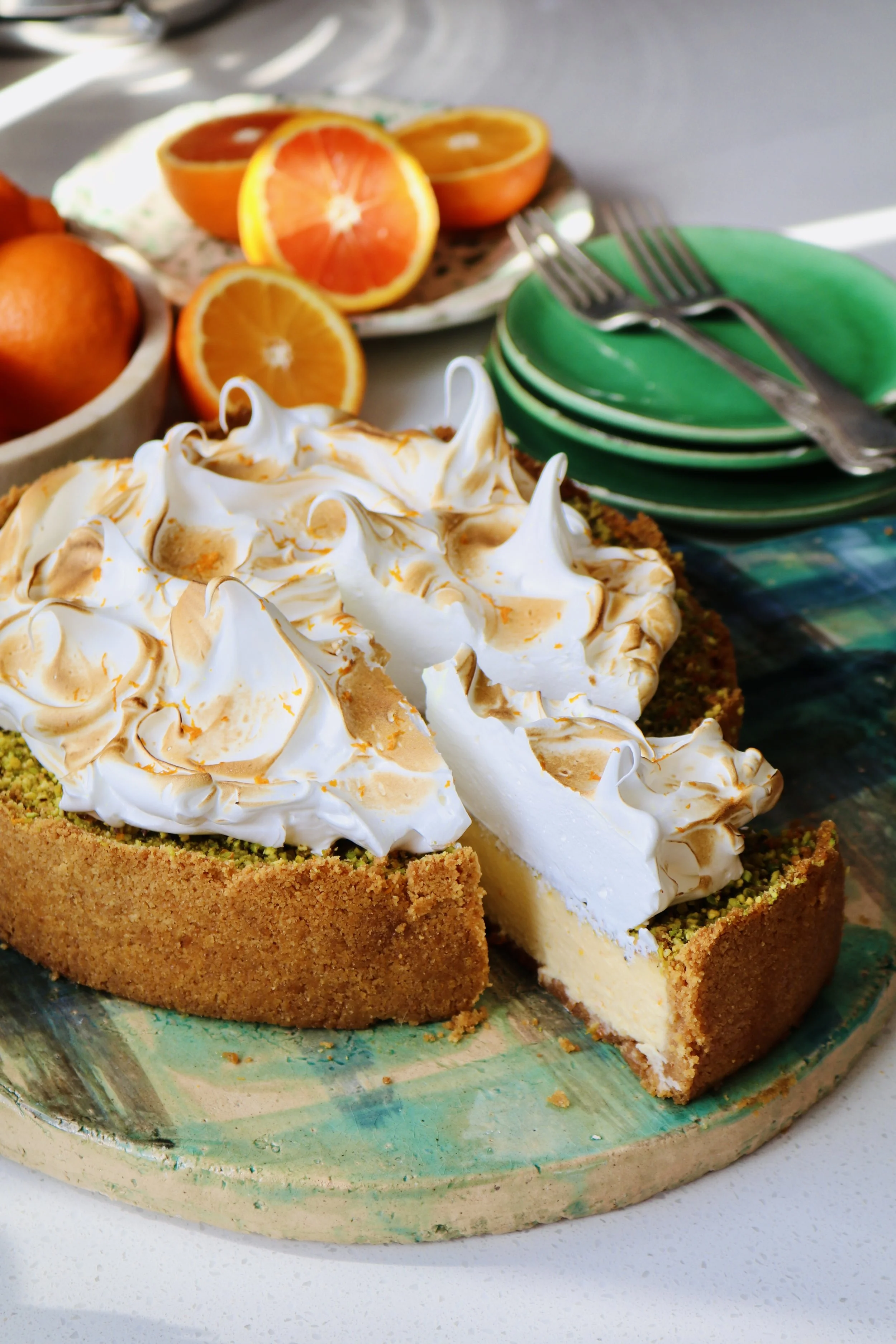 Cheats Tangelo Meringue Cheesecake With Pistachios & Orange Vanilla Syrup